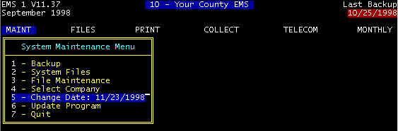 Per Screen 1, the default date is taken from your computer system date (clock). You can overwrite this date for the current session in the billing program, but this does not affect the system clock, and next time the program is started, the default date will again be the system date.