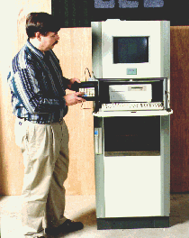 With both a remote handheld operator terminal and a built-in color monitor / keyboard, the machine operator can select patterns, change and display operating characteristics, run diagnositcs, and do many other functions from two different locations around the machine. |